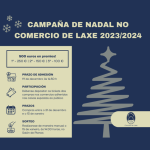 O Concello de Laxe ven de publicar as bases da Campaña de Nadal do Comercio de Laxe 2023/2024, que ten como obxectivo promover a activación económica e propiciar o fortalecemento do sector comercial municipal durante estas datas, estimulando a demanda a través do consumo en empresas locais.