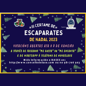 O Concello de Laxe abre o período de votacións no III Certame de Escaparates de Nadal, cuxo obxectivo é valorar, recoñecer e premiar a mellor decoración dos escaparates dos comercios e locais de hostalaría do municipio.